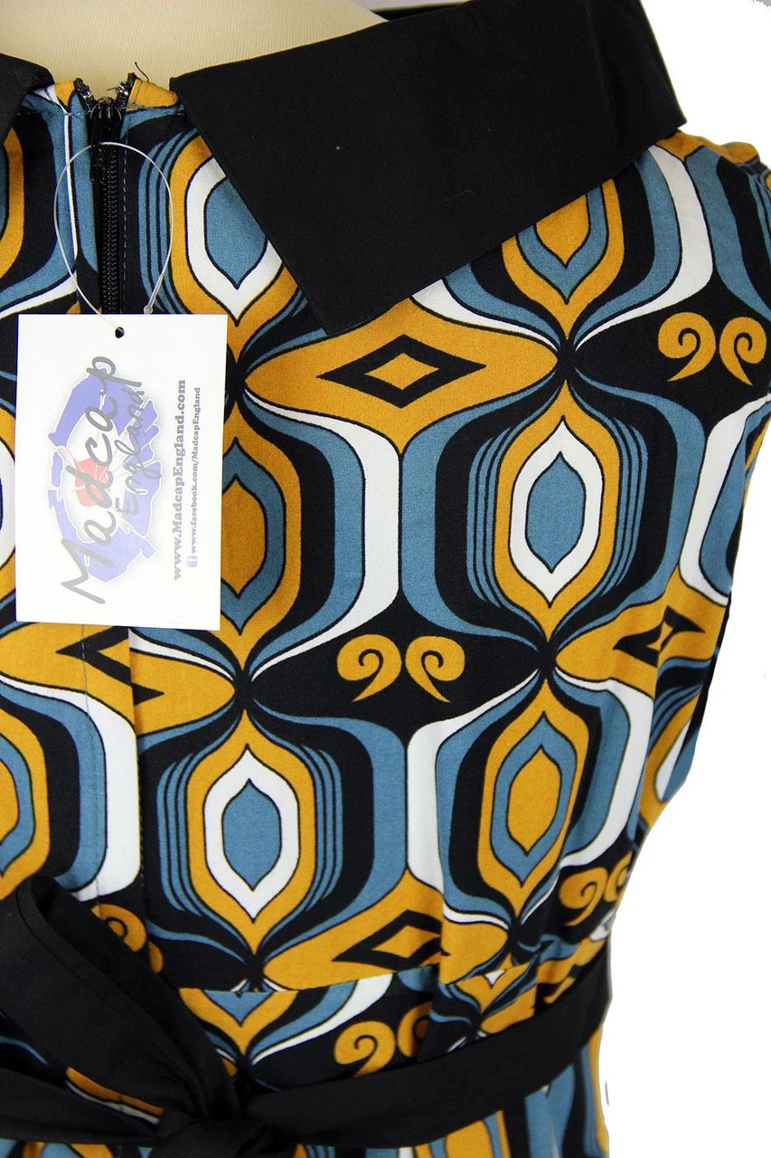 ‘ACE RETRO DRESS’ SIXTIES MOD GEOMETRIC PATTERN A-LINE DRESS by MADCAP ENGLAND – Blue, mustard, black and white Sixties Psychedelic hourglass geo print that creates an elegant Mod A-Line dress. Finished with cool Retro belt tie and folded collar detail. The ‘Ace Retro Dress’ by Madcap England.