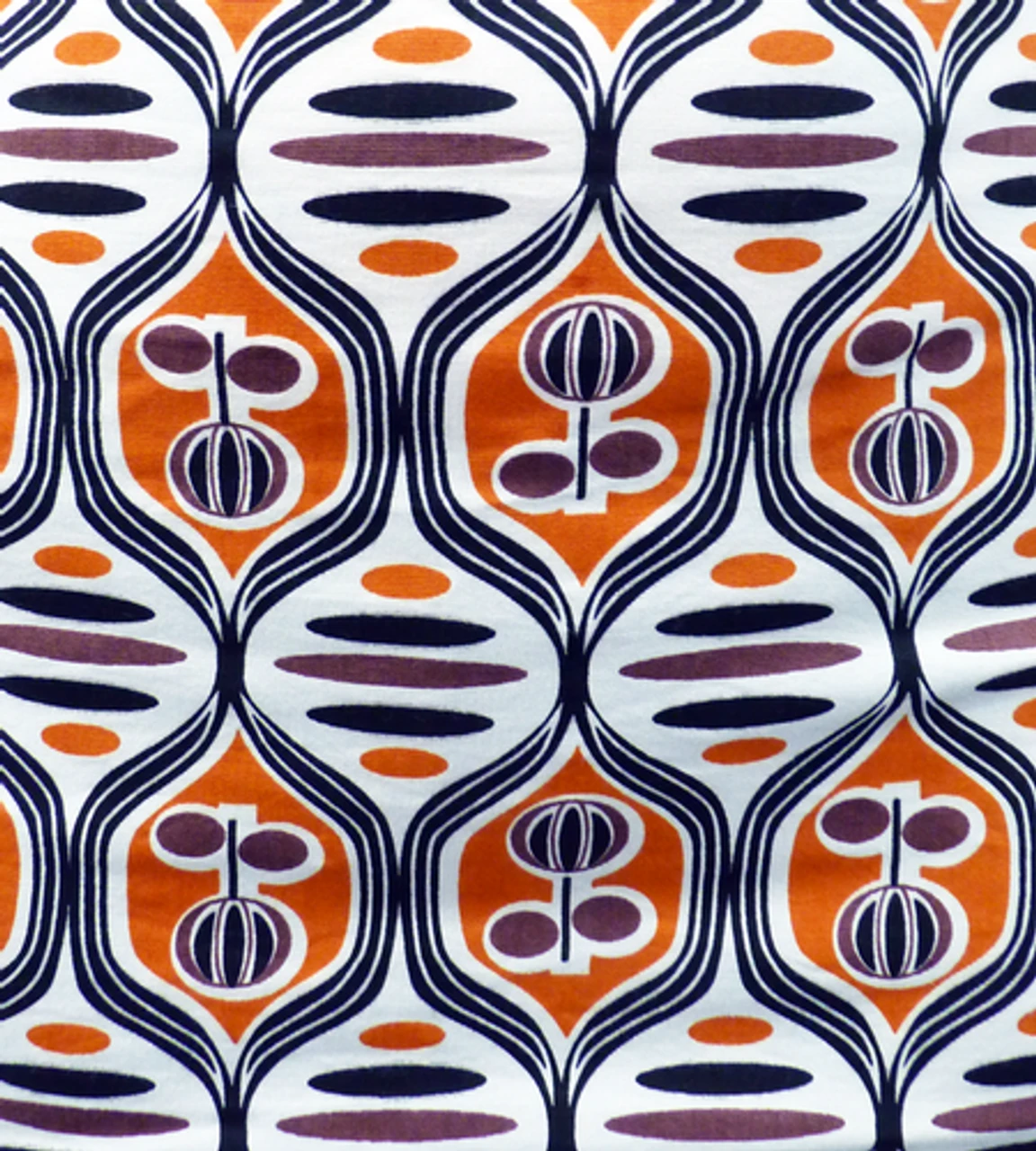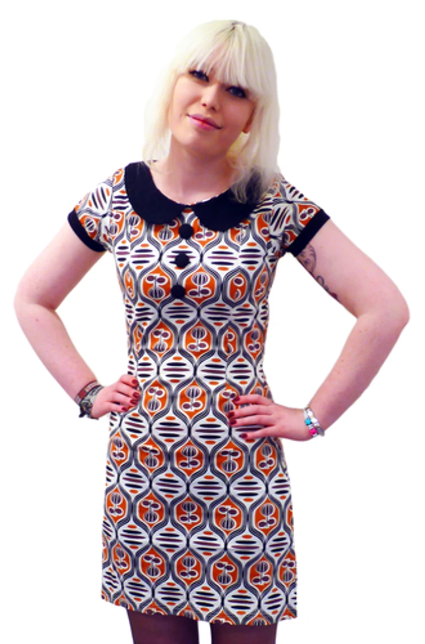 ‘DOLLIEROCKER AZTEC’ RETRO SIXTIES PETER PAN COLLAR MOD DRESS – Ecru, burnt orange, black and brown Mod Aztec print dress with Retro Sixties Peter Pan collar, 3 covered button detail, zip fasten to reverse. Slight stretch to fabric.