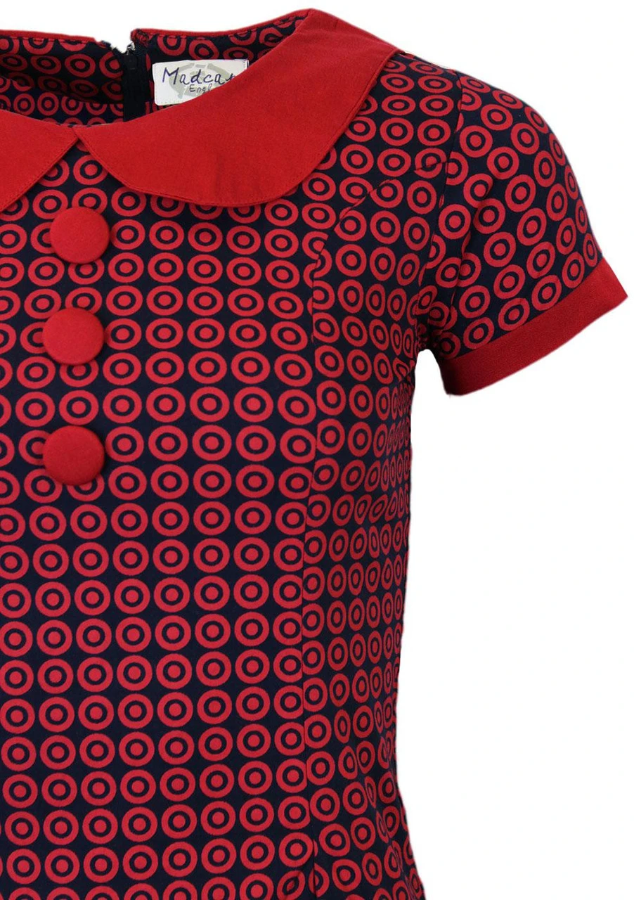 ‘DOLLIEROCKER’ RETRO SIXTIES PETER PAN COLLAR MOD TARGET DRESS – Navy blue Mod Target dress with Retro Sixties Peter Pan collar, sleeve edges and 3 covered buttons all in red. Zip fasten to reverse. Slight stretch to fabric.