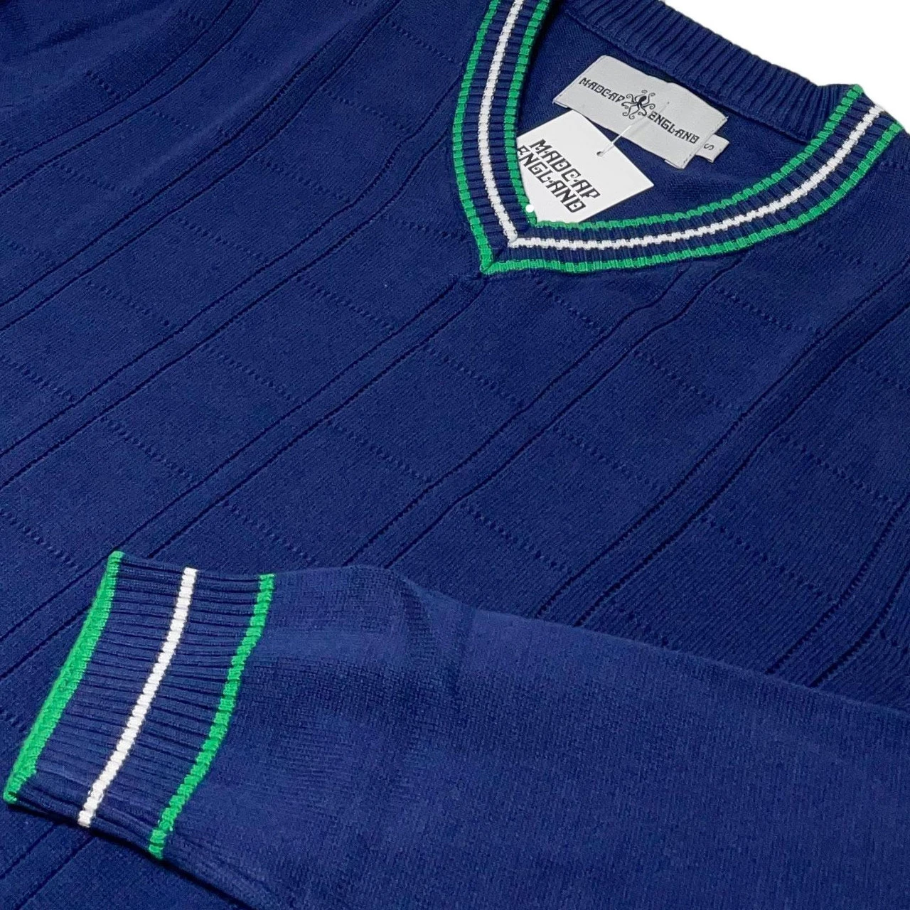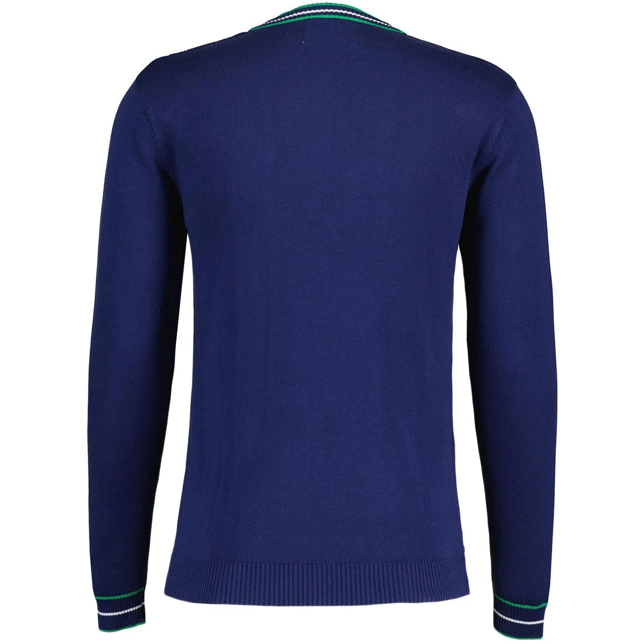 The Fellini Pointelle Knit jumper in navy is equipped with stylish green and white tipping to the v-neck collar and cuffs. Inspired by 1980s Casuals court styling, the retro sports tipping adds a stand out edge to the classic V-neck silhouette. Fine guage knitted fabrication with breathable textured pointelle detailing. Our signature Octopus embroidery in discreet tonal stitch is featured on the lower left sleeve, above the cuff.