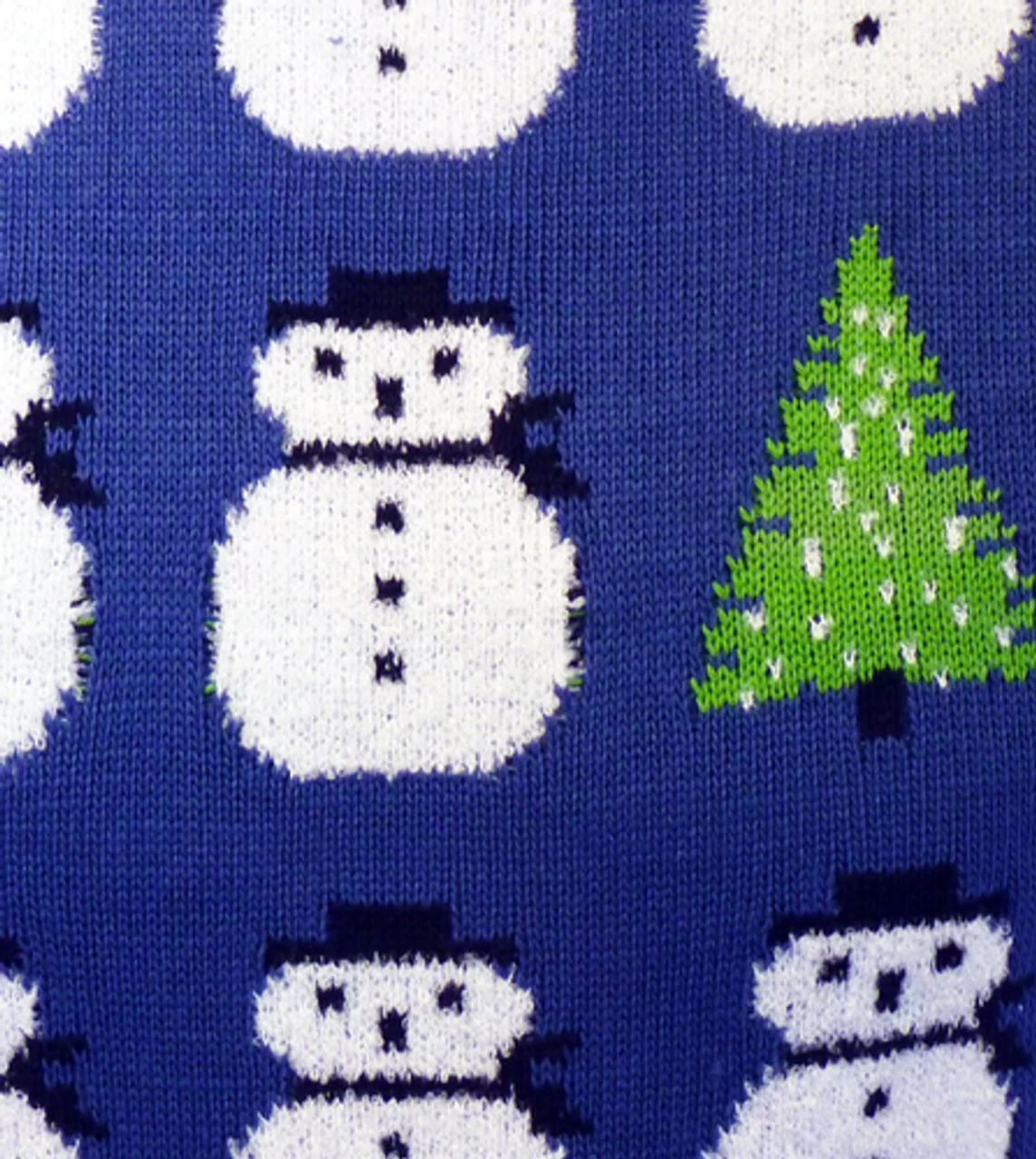 ‘FROSTY’ WOMENS RETRO SEVENTIES INDIE KNITTED SNOWMAN CHRISTMAS JUMPER – Retro knitted Christmas Jumper in airforce blue with white snowman intarsia knit throughout the front panel accompanied by a solitary Christmas tree. Plain sleeves and reverse, ribbed cuffs, collar and hem. Crew neck, Vintage knit style and an old skool Indie classic.
