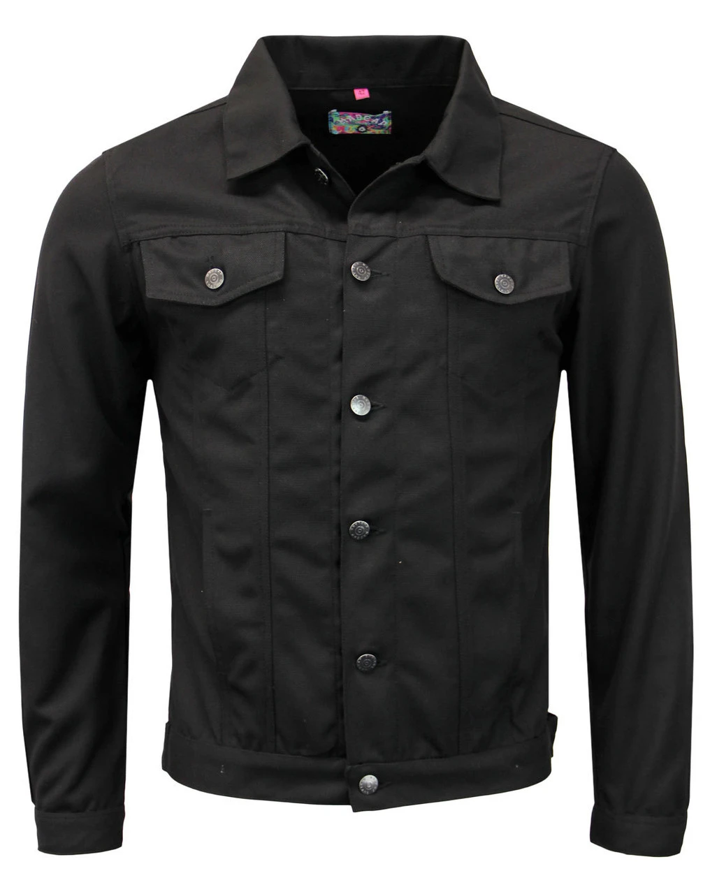 – Madcap England ‘Hoxton’ men’s 60s mod hopsack trucker jacket in black.
