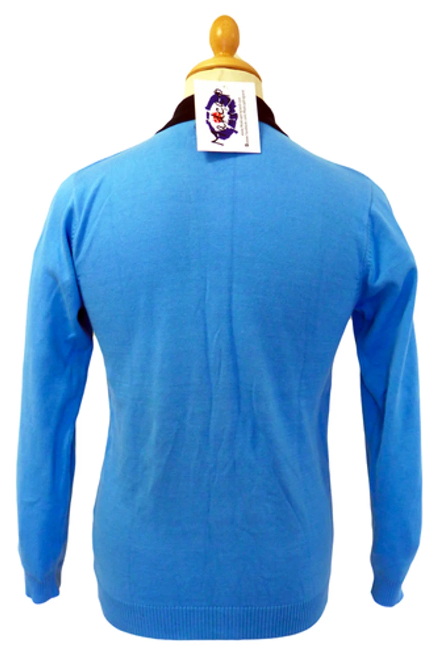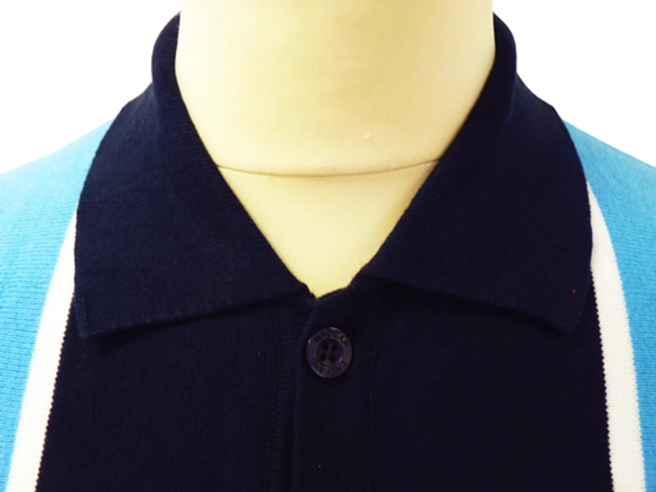 ‘MARRIOTT’ – RETRO MOD SIXTIES MENS BUTTON THROUGH POLO BY MADCAP ENGLAND – Madcap England Mens button through Polo in light blue and navy with white stripe to front. Button fasten with polo collar. Long sleeve. Ribbed cuffs and hem. Slim fit. Tonal embroidered Madcap England branding to sleeve at cuff.